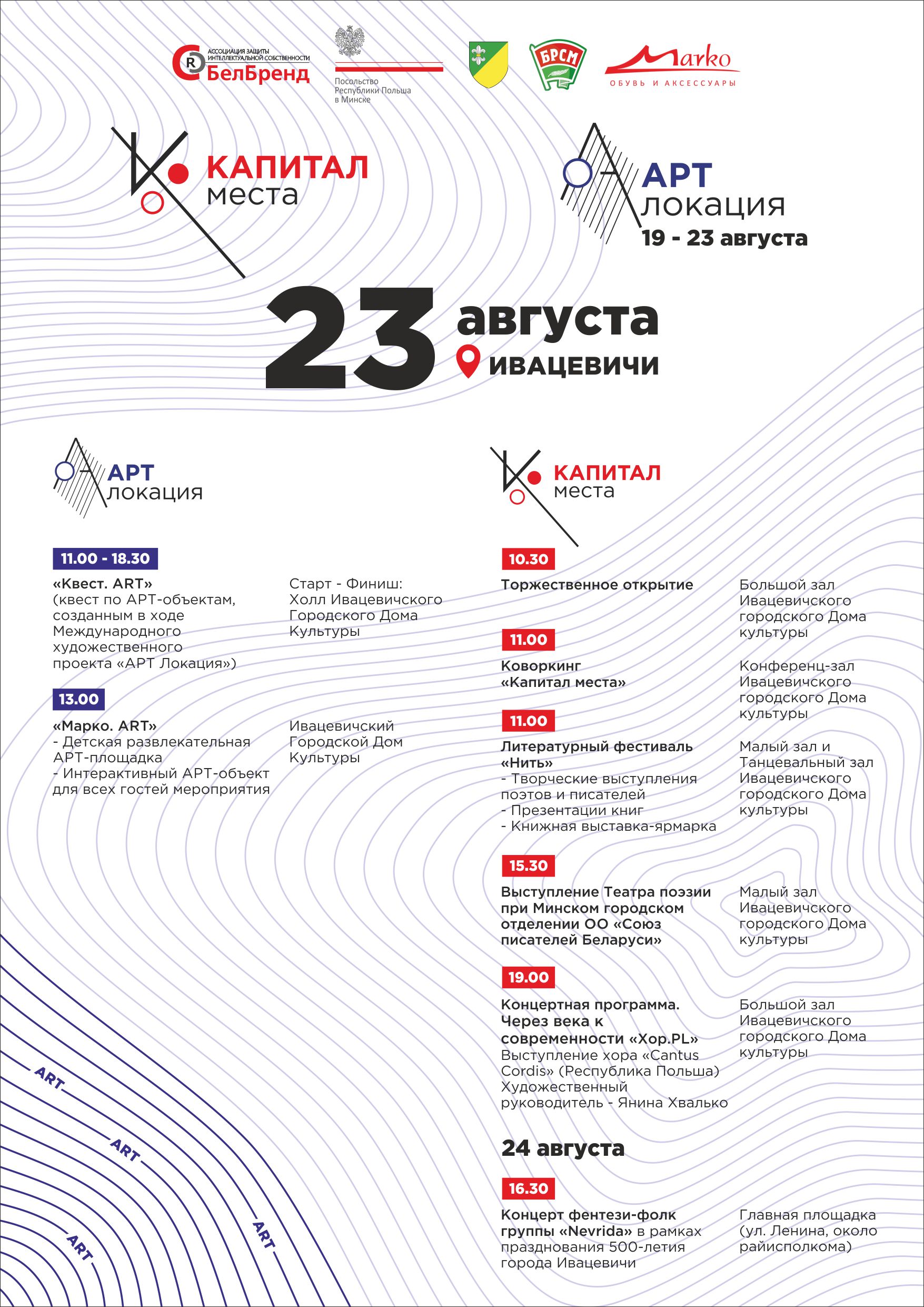 Партнерами проектов «Арт Локация» и «Капитал места» выступают Ивацевичский районный исполнительный комитет, Посольство Республики Польша в Республике Беларусь, Белорусский республиканский союз молодежи и Обувной холдинг «Марко».